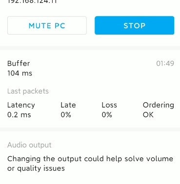 若WiFi传输音频的设置无误,在安卓设备上启动后,系统会马上搜索到服务端,点击显示出的设备就能接收并播放声音。像延时、丢包这类信息也会在此处呈现,你可以随时点击stop按钮来停止播放。