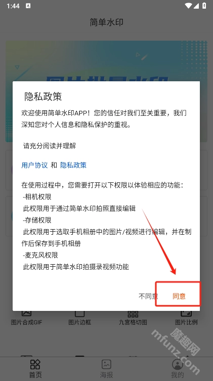 首先在魔趣网并安装简单水印。点击“同意”进入软件