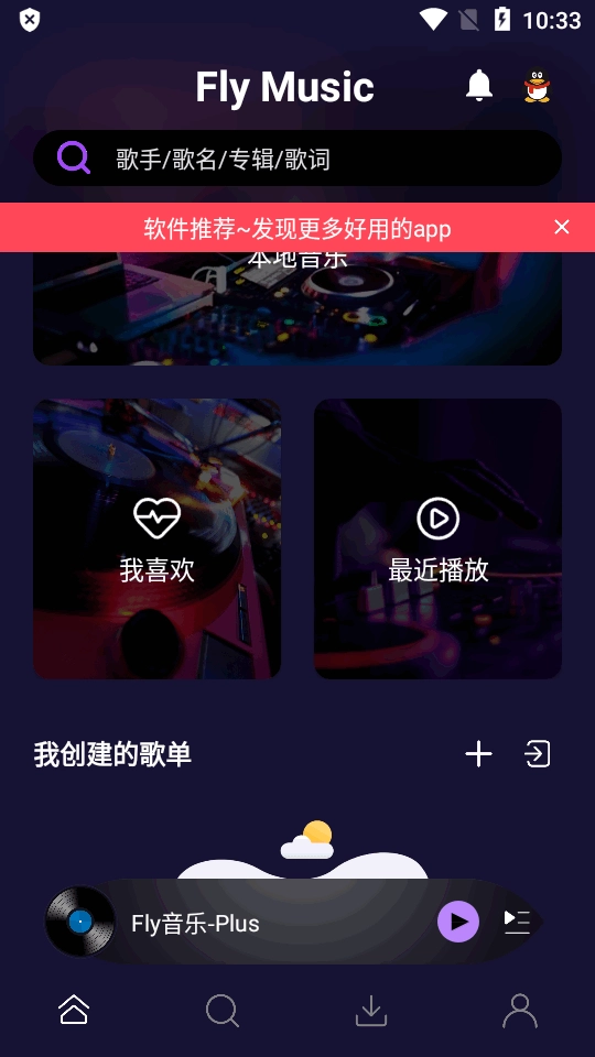 在听歌时,你可以查看本地音乐、把歌曲添加到喜欢的音乐列表、浏览最近播放的音乐,还能查看自己创建的歌单。