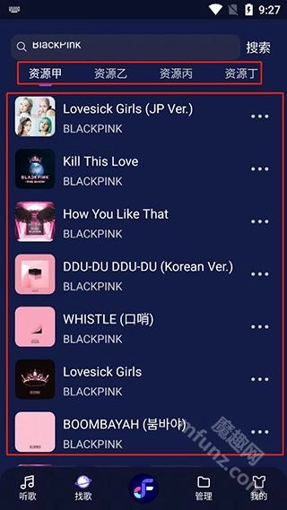 就能够找到歌曲,例如搜索BLACKPINK,就能看到甲乙丙丁等多个资源。