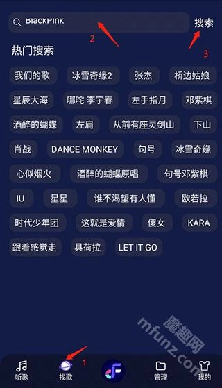 想要搜索音乐的话,只需点击“找歌”,接着在搜索框里输入歌曲名或者歌手名,最后点击搜索按钮就可以了。