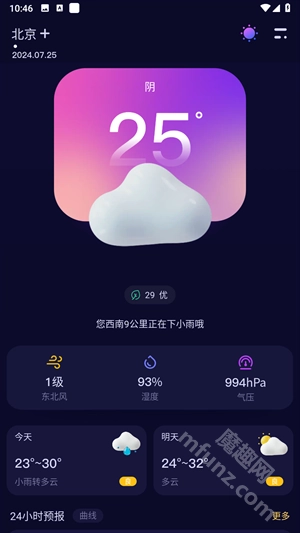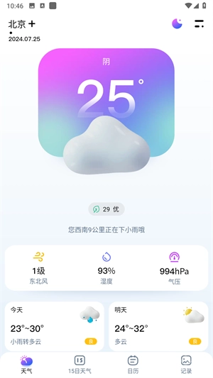 2、实时更新:具备实时天气预报功能,打开迅速且干扰,天气状况清晰直观,涵盖温度、湿度、风速等详尽信息,同时支持小时预报与空气质量的实时更新。