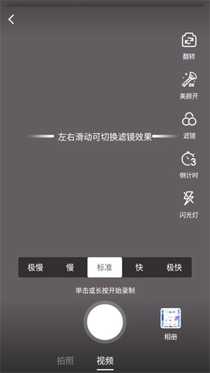 点击拍摄按钮后,用户能够自主拍摄视频或照片并发布,同时这里还提供了美颜滤镜、闪光灯等实用功能。