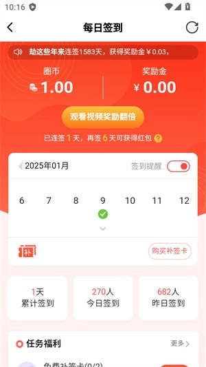 进入每日签到页面,除了签到能获取圈币外,下方还有丰富多样的任务,帮助用户轻松赚取圈币。