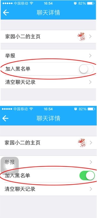 再点击右上角的头像进入详情页面,就能把对方加入黑名单啦。