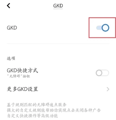 只需在无障碍功能中点击“已服务”,找到GKD并开启服务,就能正常使用了。