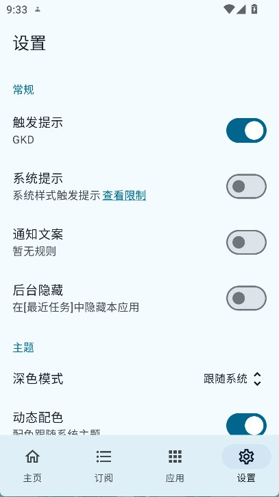 在设置界面里,您能够对后台隐藏、点击提示、订阅自动更新时间等功能进行配置。