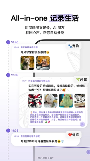 心光(lifelight)是一款融合AI聊天与生活记录功能的手机应用,既能陪用户互动交流,也能帮大家留存生活里的各种瞬间。这款软件的AI对话功能支持多种记录形式,像文字、语音、图片等都可以用来记录,覆盖得特别全面。心光安卓版配备了专属AI大模型,能随时倾听用户的心声,而最新版本还会依据用户记录的日常内容进行分析,给出最温暖的回应。另外,用户完全不必担心隐私泄露问题,因为心光的所有数据处理都在设备端完成哦!