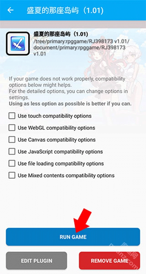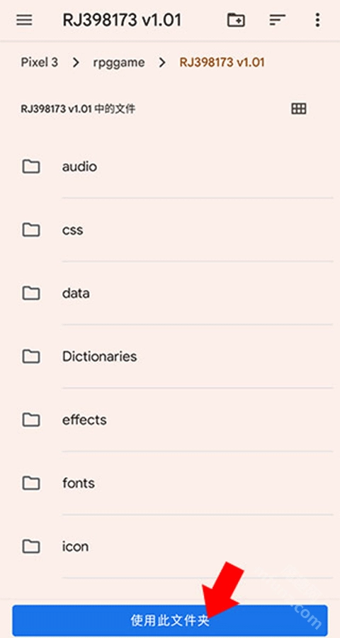 找到我们刚才解压好的游戏文件夹,然后点击下方的“使用本目录文件”按钮(要是游戏不是用RPG Maker MV制作的,会弹出提示说无法运行)。