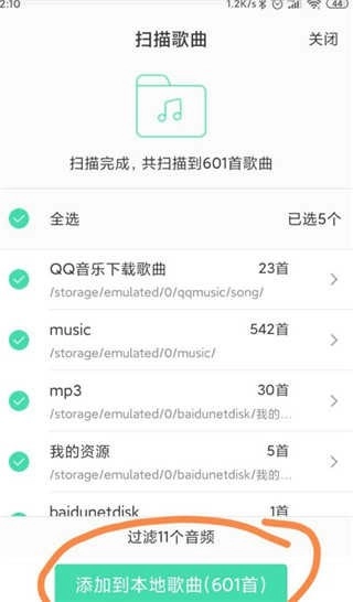 等扫描结束后,点击下方的“添加到本地歌曲”选项,就能完成从手机导入本地歌曲的操作了。