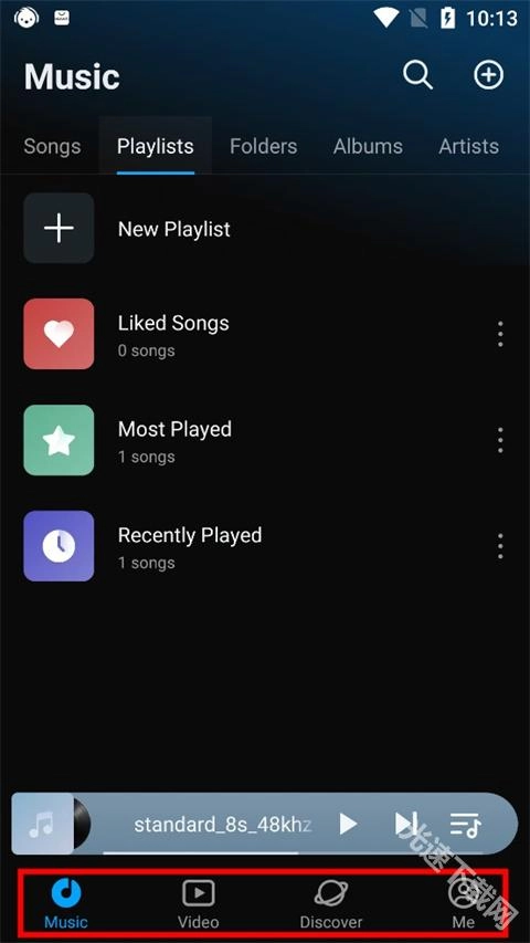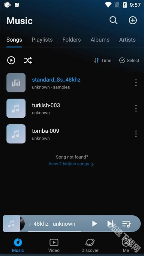 进入Lark Player,目前还不支持中文,默认显示为英文,不过它的操作并不复杂,和大家平时使用的音乐播放器比较相似,主要分为四个板块,分别是音乐、视频、发现和我的。