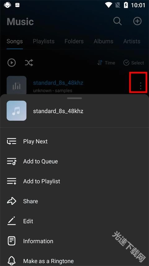 ②任意点击一首歌曲旁的三点图标,在这个界面中,你可以进行切换下一首、添加至播放列表、删除、设置成铃声等操作;