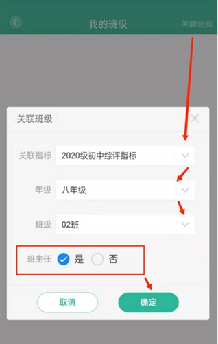 点击关联班级,选择自己所带的年级与班级;若为该班班主任,点击“是”,否则点击“否”,最后点击确定。(每个班级仅可设置一名班主任)