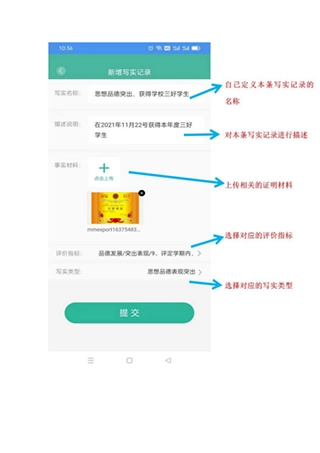 在写实记录界面填写本条记录的相关说明并上传材料,然后点击提交按钮。