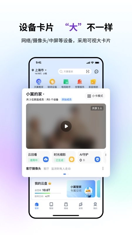 小翼管家摄像头作为中国电信智慧家庭业务的控制中枢与统一入口,整合了智能家居、天翼高清、家庭云、语音操控等功能,为用户提供智慧生活的整体解决方案,各类智能设备状态清晰可见,旨在提升您的生活品质!