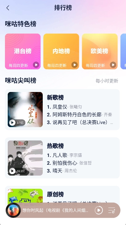 - 超全曲库,想听就听、想看就看:作为行业内领先的正版音乐平台,我们的曲库规模稳居头部行列,还拥有2000万支优质音乐视频。周杰伦、蔡依林、林俊杰、陈奕迅、薛之谦、许嵩、周深等一众顶流歌手,都能在咪咕找到。