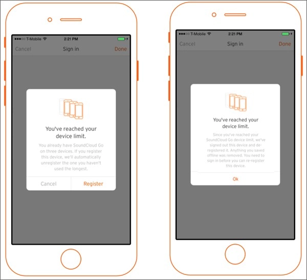 你一次最多可在3台设备上使用SoundCloud Go订阅服务(桌面端使用该服务不受此限制)。若要登录第四台设备,系统会提示你确认操作,此时最旧的登录会话将被自动注销,且该旧设备上用于离线收听的曲目或播放列表也会被删除。登录第四台设备时,你会收到通知,告知对旧设备的上述更改。另外,30天内你最多可登录10台设备。同时,你的Go/Go+订阅同一时间仅支持一台设备收听,若尝试在多台设备同时使用订阅,会收到“因你在另一设备开始播放,当前播放已暂停”的提示。