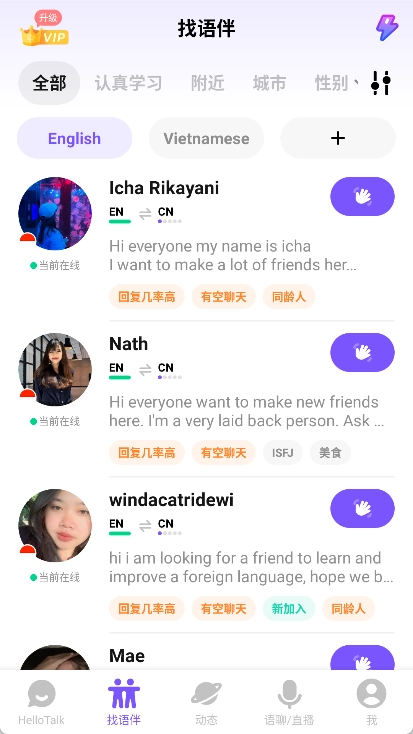 搜索:轻松快捷地找到全球各地的母语语言伙伴;既可以依据地理位置查找离你最近的人,也能按照国家或城市来指定搜索目标。要是你收到他人的问候或者获得外语学习方面的帮助,可别感到惊讶。