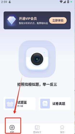 返回首页打开“拍照”即可对准题目拍照识别出答案