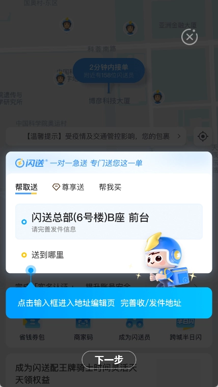 在您完成下单的那一刻,系统便会启动智能调度机制,自动把任务指派给距离您最近的闪送员,以此保证闪送员能第一时间上门提供服务。