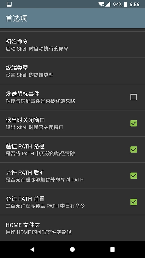 在设置的末尾部分有home文件夹的相关配置项,我们能够把它调整为手机内部存储里的某个目录。