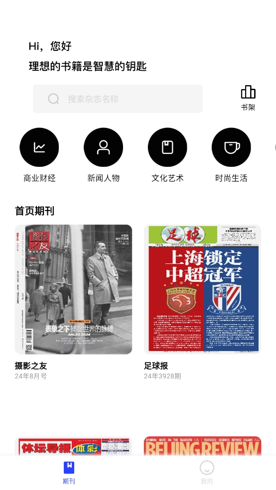 首页设有详尽的期刊分类,涵盖商业财经、新闻人物和文化艺术等类别。