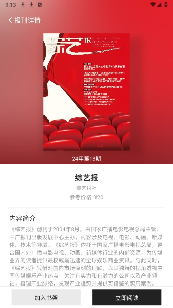 找到心仪的期刊书籍后点击进入,既可以选择“立即阅读”,也能把喜欢的书籍添加到“书架”中。