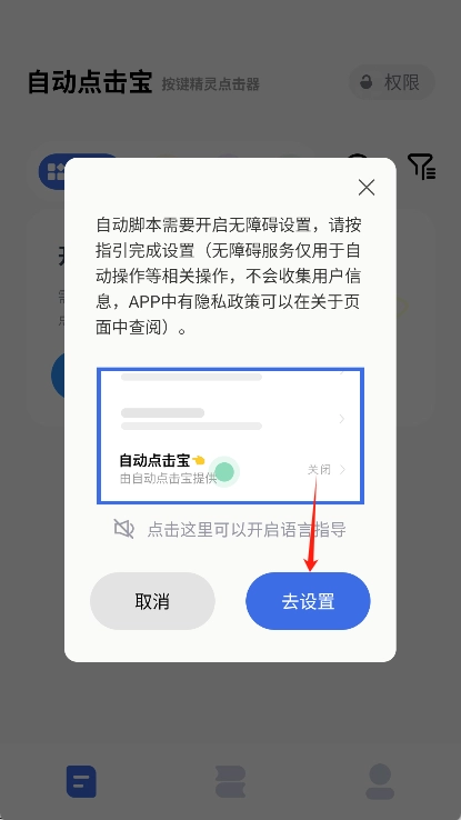开启权限:进入首页后,按照页面提示开启悬浮窗权限、无障碍服务等所需的各项权限。