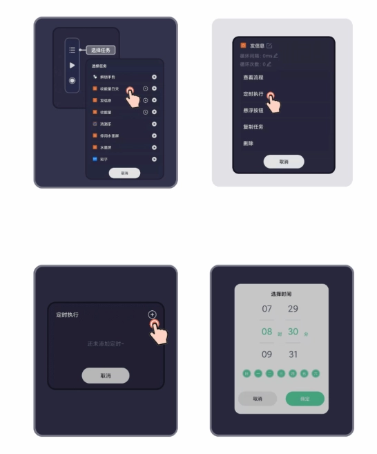 在已录制完成的脚本里,能够对自动点击的频率、延迟时长等参数进行设置,同时该功能还支持定时执行,允许用户设定在特定的时间点自动启动和终止点击任务。