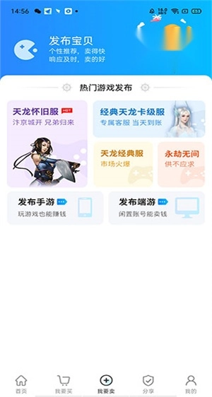 进入“我要卖”界面后,你可以发布自己的账号以及端游账号,在平台上进行出售。