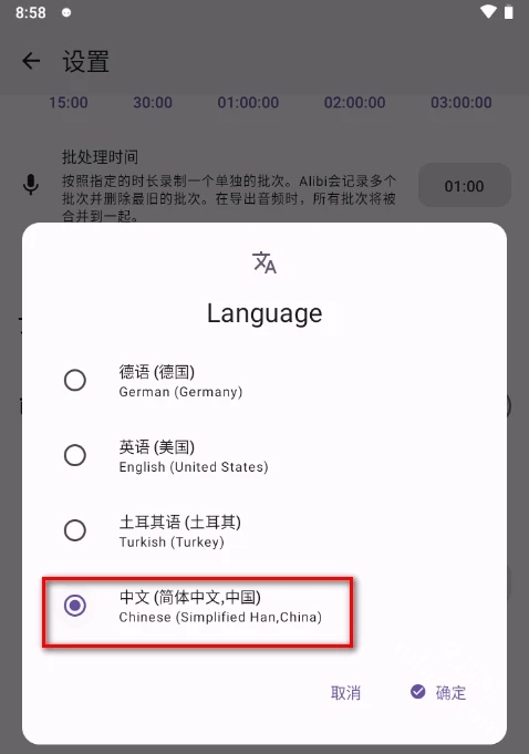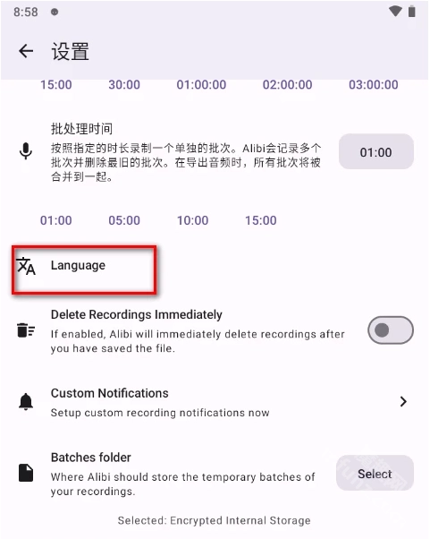 设置语言的操作步骤如下:启动Alibi软件后,找到并点击设置按钮,在设置选项中选择“language”,接着在语言列表里选中“简体中文”就完成了。