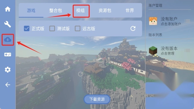 打开Fold Craft Launcher后,点击左侧的云朵图标,也就是【模组】选项,然后从社区模组里进行操作。