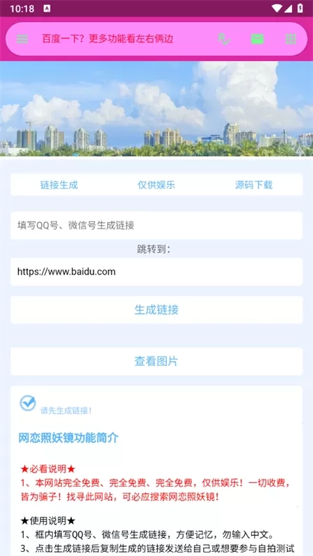 2、若想使用网恋照妖镜,只需填写QQ号、微信号并生成链接,就能查看图片。
