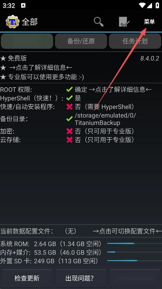 打开钛备份App,进入软件后请留意红圈内标注的备份目录。系统会自动在/sdcard路径下创建名为TianiumBackup的文件夹,用于存放你备份的内容。