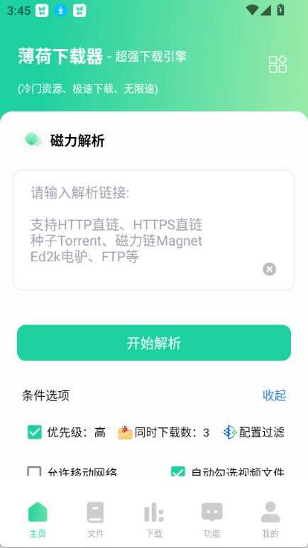 在薄荷器里,你得输入或者粘贴想要的文件对应的磁力链接,接着点击开始解析按钮。