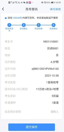 确认报名信息填写无误后,输入信息保存密码,点击【提交保存】按钮,待系统提示保存成功,即完成报名信息填写。(温馨提示:高考报名期间,考生可随时登录系统修改个人信息,逾期将无法再进行修改操作)