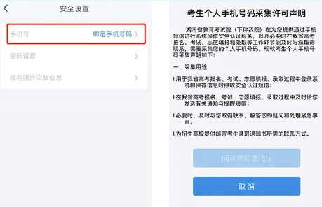 点击底部导航栏的【个人信息】选项,进入个人信息管理界面,接着依次点击【安全设置】与【绑定手机号码】。请认真阅读考生个人手机号码采集许可声明,若同意该采集要求,点击【阅读并同意】按钮,随后即可开展手机号码绑定的相关操作。