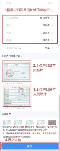 请上传户口簿首页(需包含住址信息)与本人户口页的电子图片,并选择户口簿上的住址信息,选择时需具体到街道或乡镇级别。