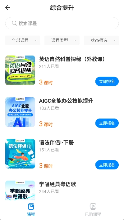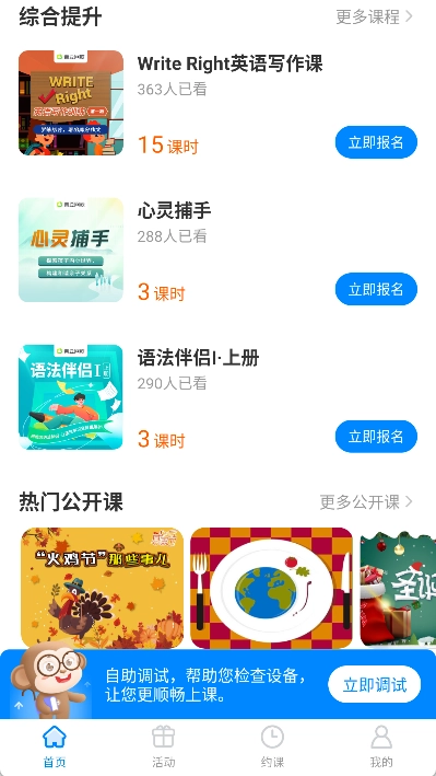 在首页能够查看各式各样的课程类别,涵盖生活口语、自由对话、语音课程以及综合英语等。