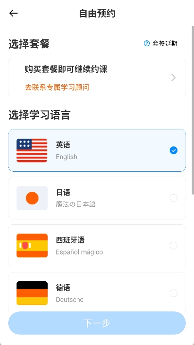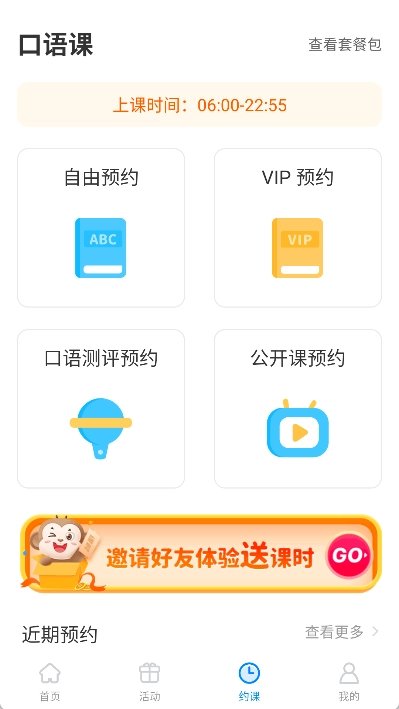初次测评与约课一般由课程顾问协助完成,后续则支持自主约课操作。