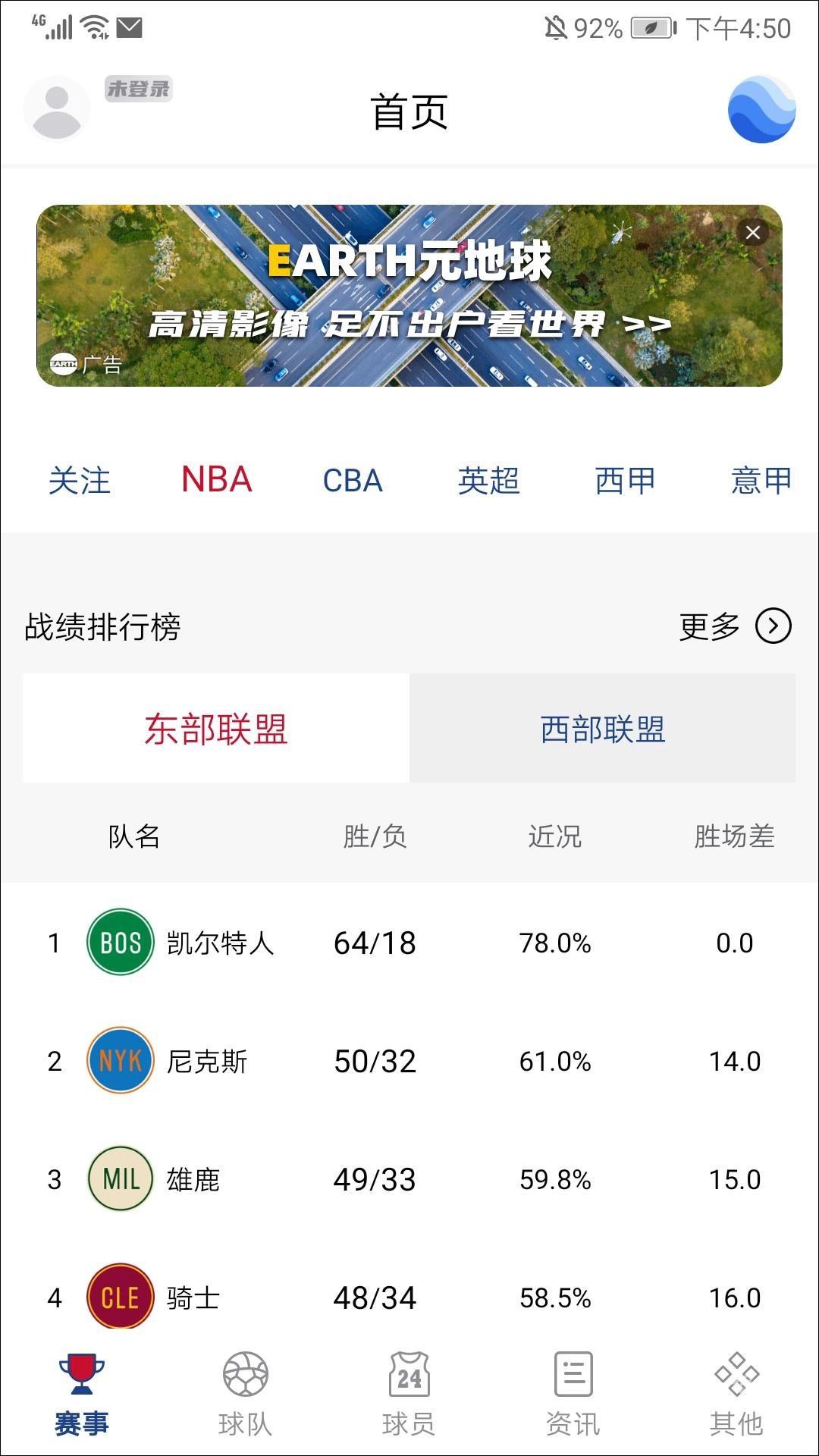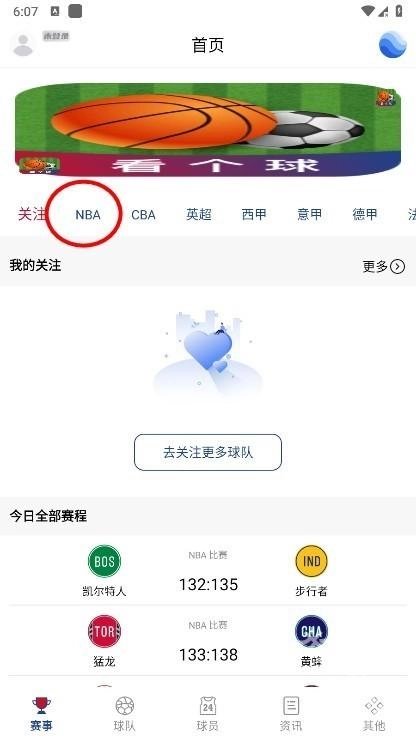 打开软件后,进入赛事界面,这里涵盖了NBA、CBA、英超、西甲、意甲等各类赛事,下面就以NBA凯尔特人队为例来进行说明。