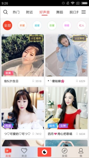 在附近的分类里,能找到离我们最近的主播,位置是可以自由切换的。而好声音分类点进去后,就能快速看到一些排名非常靠前的主播,用户可以选择关注这些主播,方便之后再看他们的内容。