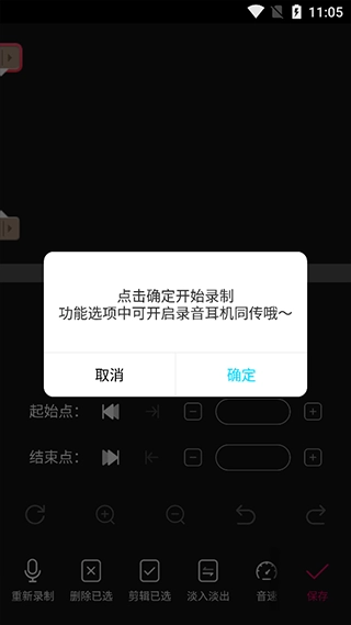 录音结束后会自动跳转至剪辑界面,若对某段录音不满意,可在该界面选择需剪辑的音频时间段——既支持左右拖动来选定范围,也能在编辑框中直接输入具体的开始与结束时间;待时间参数确认无误后,点击剪辑页面的保存按钮,即可获取目标时间段内的录音音频文件。
