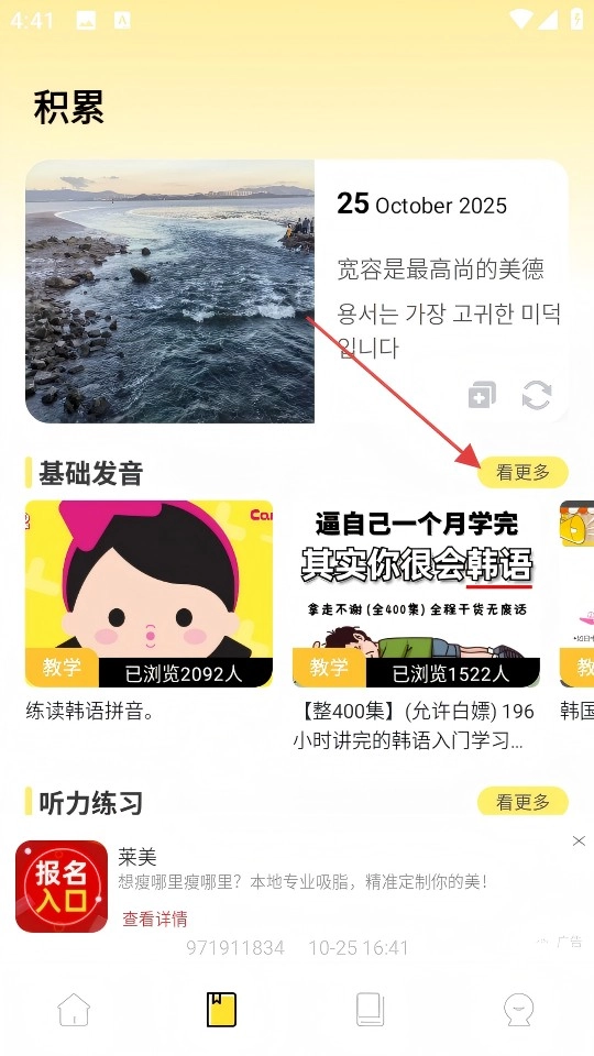 在积累页面找到基础发音板块,点击其右侧的【看更多】按钮,即可进入基础发音课程的列表页面。