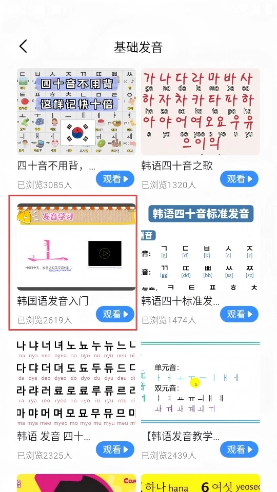 在基础发音课程列表里,点击【韩国语发音入门】这一项,就能进入到该课程对应的视频列表页面。
