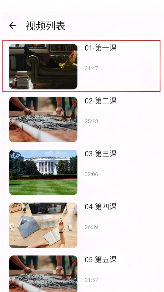 在视频列表页面点击【01-第一课】,就能开启第一课的学习内容。