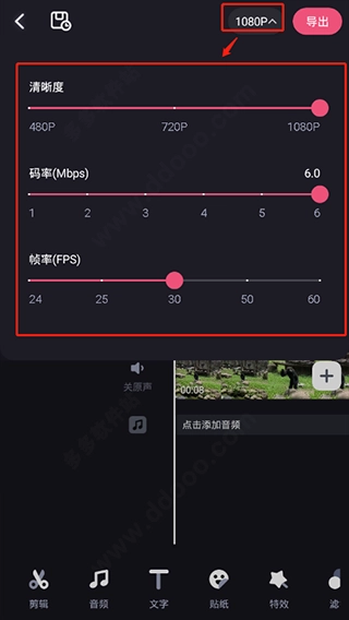 视频清晰度会显示在右上角,点击该区域即可自定义设置清晰度、码率和帧率。