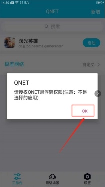 首次启动时会弹出“授权Qnet悬浮窗权限”的提示,点击“ok”后会跳转至悬浮窗管理界面,此时需开启Qnet的悬浮窗权限。