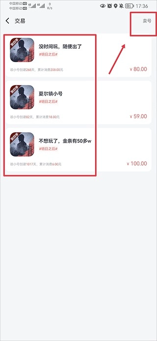 最后在卖号界面选择你想出售的小号,填好交易资料后发布就行啦