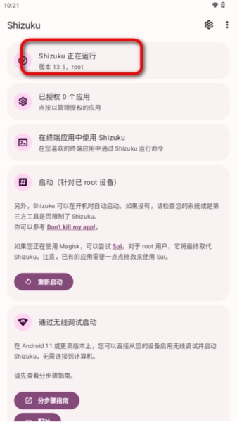 若出现shizuku服务未运行的提示,需安装shizuku软件并启动它。